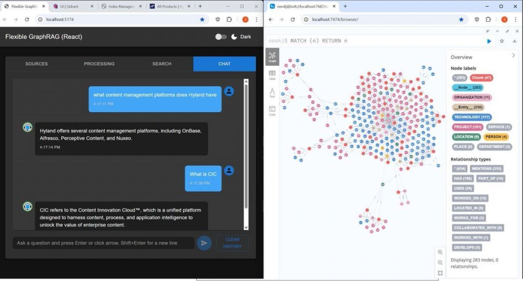 (Flexible GraphRAG AI chat shown with Hyland products web page(s) used with web pages data source to auto-generated a Neo4j graph).
